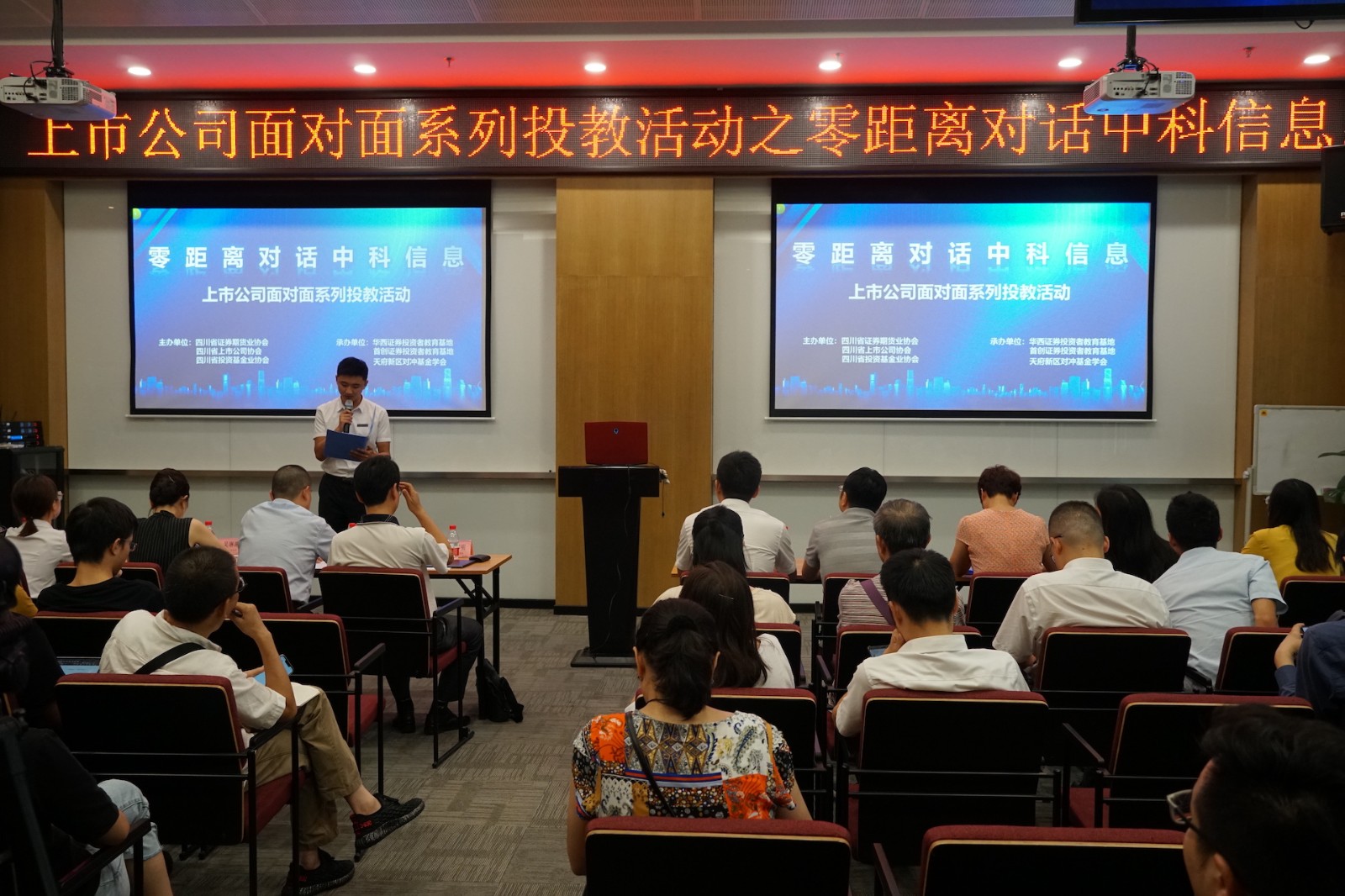 8月28日下午, 中科信息 (證券代碼:300678)參加了由四川省證券期貨業(yè)協(xié)會、四川省上市公司協(xié)會、四川投資基金業(yè)協(xié)會主辦的上市公司面對面系列投資者教育活動。此次活動主題為“零距離對話中科信息”,中科信息董事會秘書尹邦明、財務(wù)總監(jiān)劉小兵、四川省上市公司協(xié)會會員部副主任黃慶華及四川省內(nèi)部分機(jī)構(gòu)及個人投資者100余人參與了本次活動。