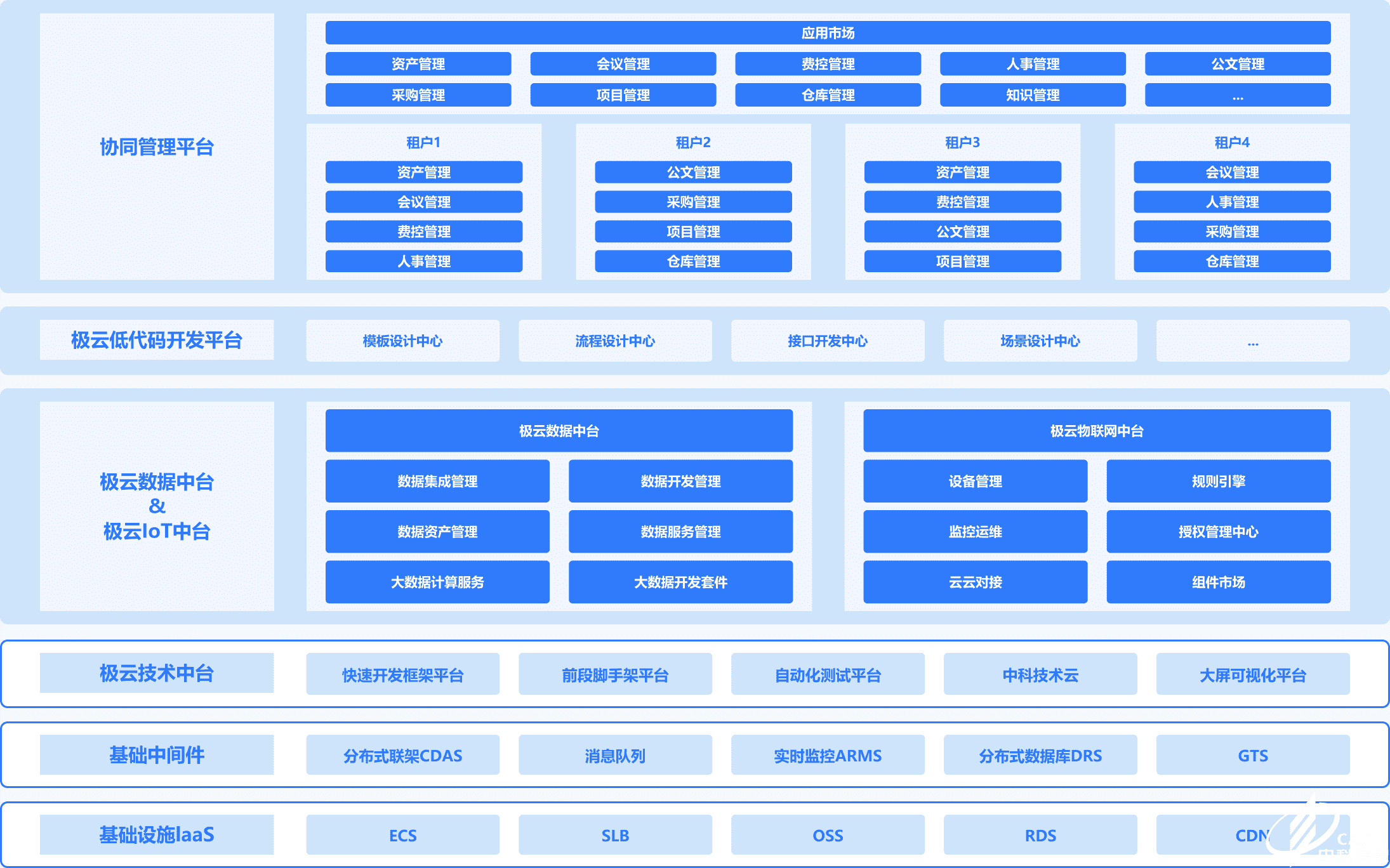中科極云平臺(tái)是一款具有完全自主知識(shí)產(chǎn)權(quán)的企業(yè)級(jí)通用服務(wù)開發(fā)平臺(tái),包括:極云協(xié)同管理平臺(tái)、極云低代碼開發(fā)平臺(tái)、極云數(shù)據(jù)中臺(tái)、極云物聯(lián)網(wǎng)中臺(tái)和極云技術(shù)中臺(tái),是由中科院成都信息技術(shù)股份有限公司基于多年面向行業(yè)化的軟件工程、軟件平臺(tái)、軟件開發(fā)技術(shù)的研究應(yīng)用沉淀整合而來。平臺(tái)采用微服務(wù)、云計(jì)算、大數(shù)據(jù)、流程引擎、統(tǒng)一認(rèn)證等先進(jìn)技術(shù),提供常用的軟件開發(fā)框架及組件庫,將軟件信息化需求抽象成標(biāo)準(zhǔn)的流程、數(shù)據(jù)模型,采用低代碼可視化配置開發(fā)的方式,提供了支持跨平臺(tái)的通用軟件開發(fā)能力。