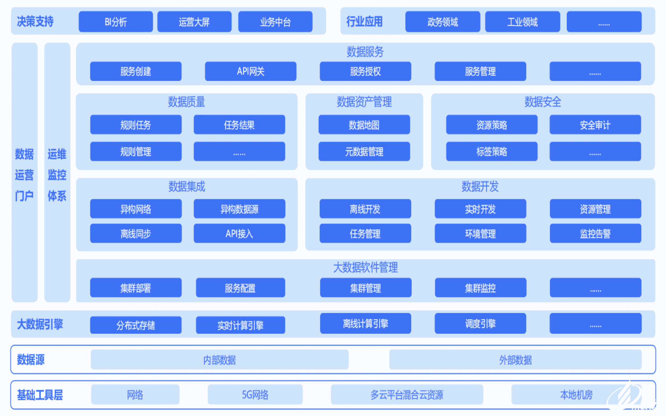 極云數(shù)據(jù)中臺(tái)將大數(shù)據(jù)應(yīng)用開發(fā)作為基礎(chǔ)設(shè)施,將海量數(shù)據(jù)進(jìn)行采集、 計(jì)算、存儲(chǔ)、加工,同時(shí)建立統(tǒng)一標(biāo)準(zhǔn)和口徑。通過數(shù)據(jù)治理形成數(shù)據(jù)資產(chǎn),進(jìn)而向 上支撐應(yīng)用,提供高效的服務(wù)。同時(shí)減少數(shù)據(jù)重復(fù)建設(shè)、又降低煙囪式協(xié)作的成本, 為企業(yè)的業(yè)務(wù)創(chuàng)新持續(xù)賦能