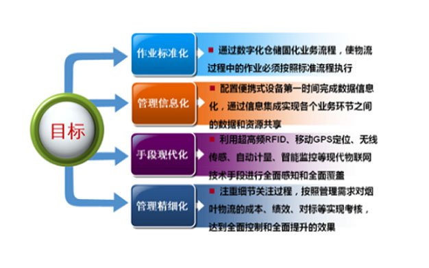 實(shí)現(xiàn)中心倉(cāng)庫(kù)煙葉的入庫(kù)、出庫(kù)、移庫(kù)、倉(cāng)儲(chǔ)、盤點(diǎn)、物流的數(shù)字化和可視化管理。包括基于 RFID煙包標(biāo)簽的定位和溯源、倉(cāng)儲(chǔ)各環(huán)節(jié)精細(xì)化管理、煙葉庫(kù)溫度濕度監(jiān)控、可視化倉(cāng)儲(chǔ)展示、數(shù)字化管理等。所涉技術(shù)包括移動(dòng)互聯(lián)、超高頻RFID、GPS定位、虛擬仿真、無線溫濕度傳感、智能視頻分析與監(jiān)控、自動(dòng)計(jì)量傳送帶等,運(yùn)用標(biāo)準(zhǔn)質(zhì)量控制PDCA循環(huán)對(duì)供應(yīng)鏈上游進(jìn)行引導(dǎo)和控制,采集下游反饋信息改進(jìn)物流工作水平,達(dá)到煙葉物流工作的全面控制和全面提升。
